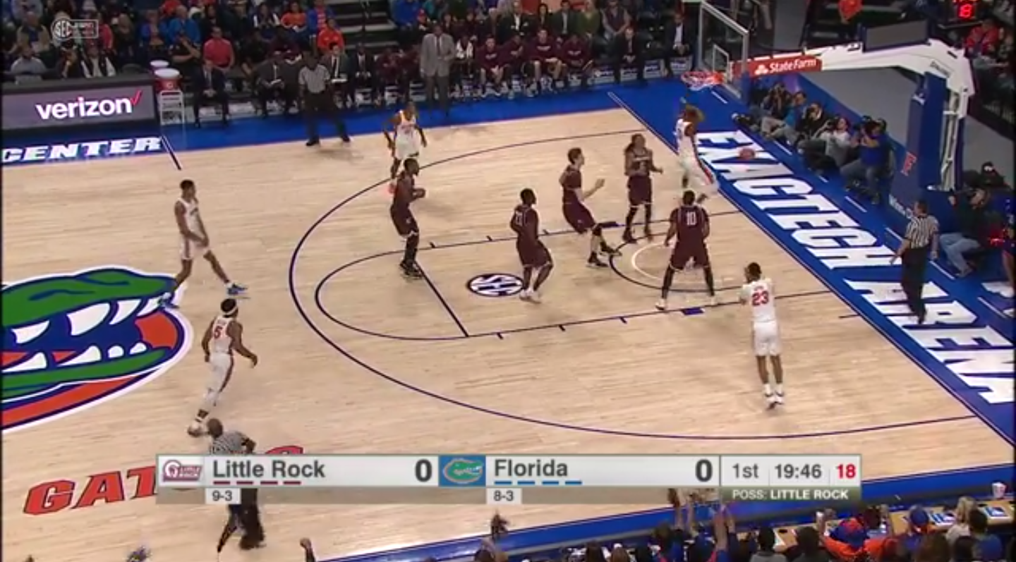 Florida came out extremely well, as they raced to a 9-0 lead before Little Rock was forced to call a timeout. The timeout didn’t help. Florida hit 21 of their first 28 shots in the new building. At halftime Florida was shooting almost 70%, including 56% from behind the three-point arc. Florida coasted easily in the second half as eleven players saw action.
