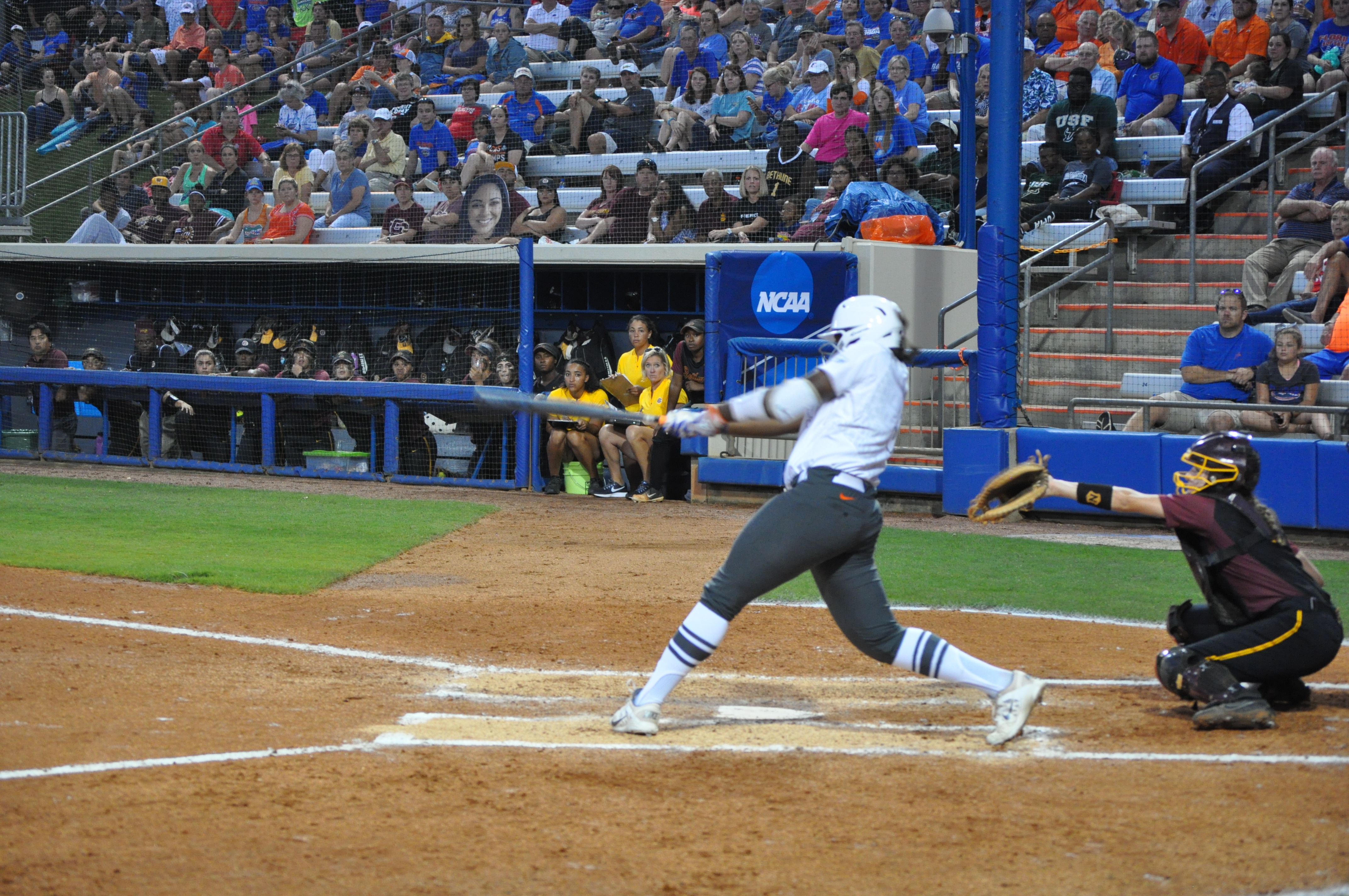 However, as anyone can tell you, there is no ‘weak link’ in this Florida lineup. In the second inning Jaimie Hoover hit a pinch-hit, two out, three-run homer and the Gators never looked back. Hoover said after the game that “I knew it was going out when I hit it.”
