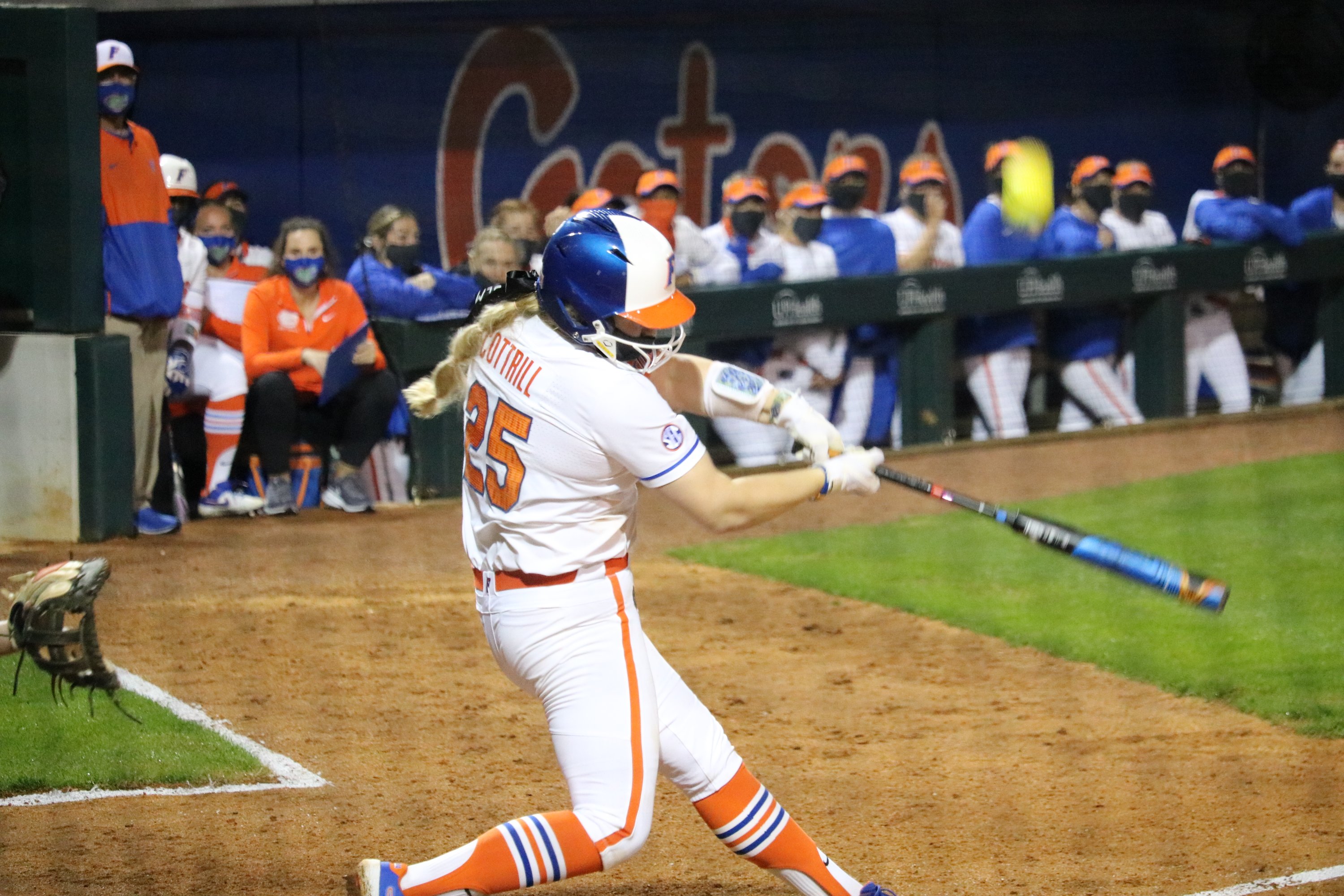 After hitting her first career home run, Cottrill gave credit to assistant coach Aric Thomas who told the sophomore catcher to anticipate inside pitches. “They’re going to throw you inside, so just be ready for it and hit it over the scoreboard,” Thomas said.