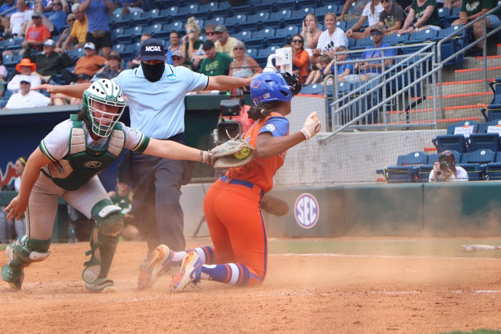 Chronister faced Bulls first baseman Bethaney Keen who singled up the middle to break the Gators’ combined no-hitter. But Florida center fielder Cheyenne Lindsey, catcher Julia Cottrill and third baseman Charla Echols pulled off a miraculous 8-2-5 double play to escape the jam.