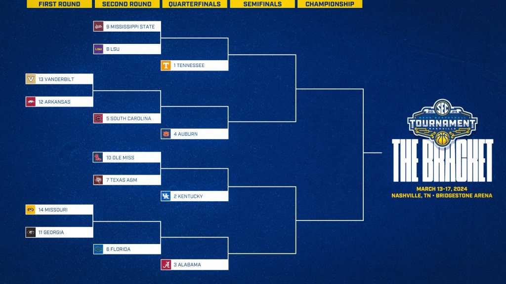 This includes the No. 9 Kentucky Volunteers (23-8, 13-5 SEC), the No. 19 Alabama Crimson Tide (21-10, 13-5 SEC) and the No. 15 Auburn Tigers (24-7, 13-5 SEC), all of whom earned double-byes in the SEC tournament due to their top four seeding.