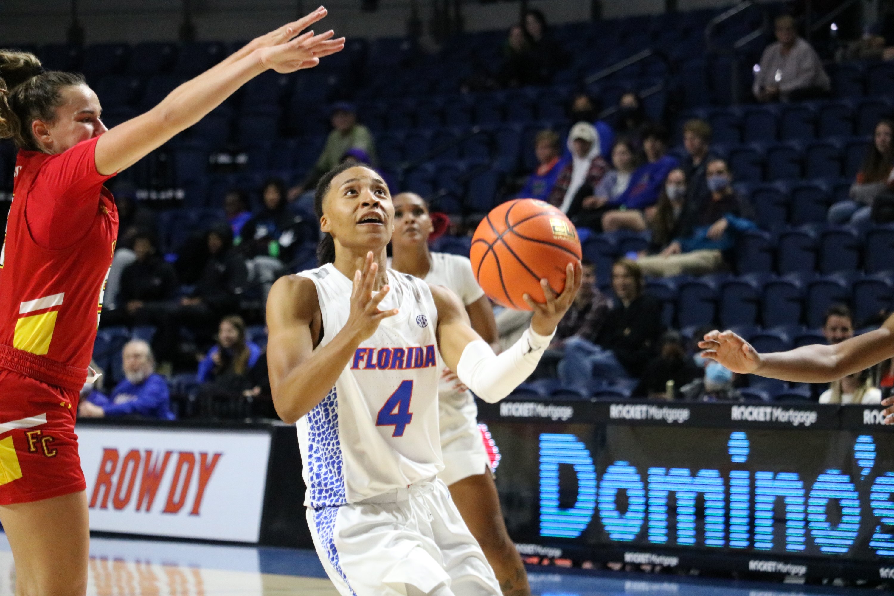 The two teams struggled to find the hoop at the open of the fourth quarter until Florida’s Jordyn Merritt nailed a pair of three-pointers to bring the Gators within three points. A driving layup by Broughton and a trey from Kristina Moore put Florida ahead 64-62 with 5:25 remaining. The remainder of regulation was a tug-of-war with neither side gaining a lead larger than five (by Florida with 3:56 to play).